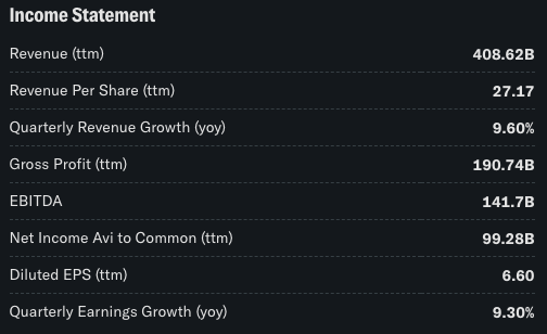 | Fiscal Year Ends: 9/28/2024 | 애플의 2024년 회계연도는 2023년 10월~2024년 9월. 문서의 연간 데이터(예: 매출 408.62B, ROE 149.81%)는 이 기간을 기반으로 합니다. |