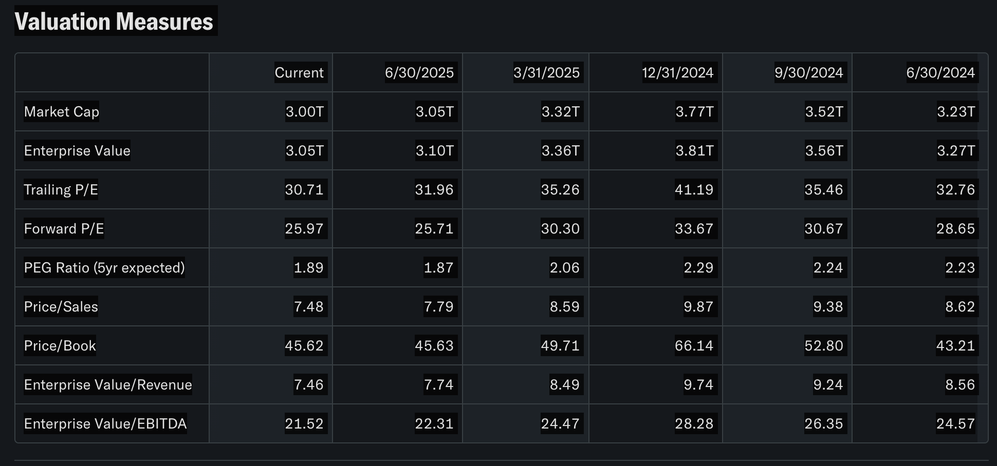 🔹 1. Valuation Measures (가치 평가 지표)