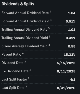 | Last Split Factor / Date | 주식 액면분할 비율과 날짜 (예: 4:1 = 주식 1주 → 4주로 쪼개짐). |